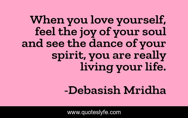 This page presents the quote "When you love yourself, feel the joy of your soul and see the dance of your spirit, you are really living your life.". Author of this quote is Debasish Mridha. This quote is about life, love, knowledge, inspirational, intelligence, philosophy, wisdom, quotes, affection,.