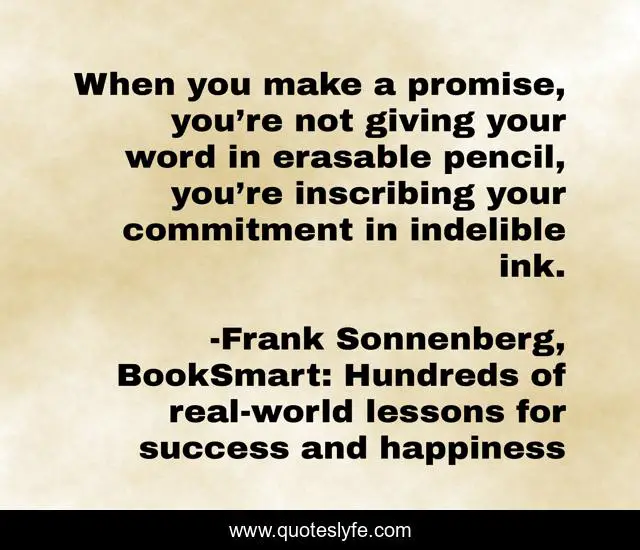 This page presents the quote "When you make a promise, you’re not giving your word in erasable pencil, you’re inscribing your commitment in indelible ink.". Author of this quote is Frank Sonnenberg, BookSmart: Hundreds of real-world lessons for success and happiness. This quote is about promises, promise, commitment,.