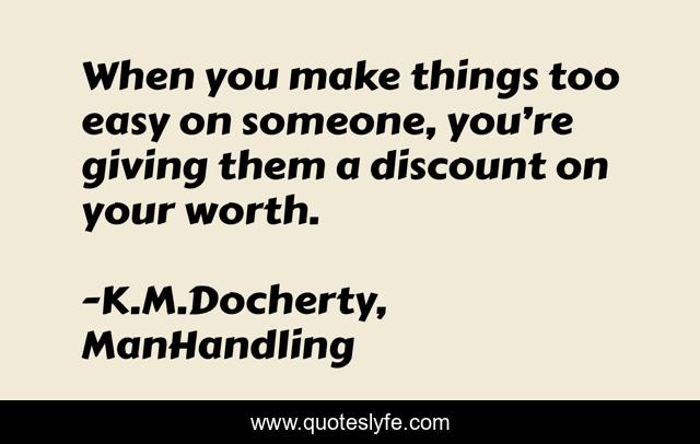 This page presents the quote "When you make things too easy on someone, you’re giving them a discount on your worth.". Author of this quote is K.M.Docherty, ManHandling. This quote is about love, female-empowerment, inspirational, enthusiasm, dating, affection, women,.