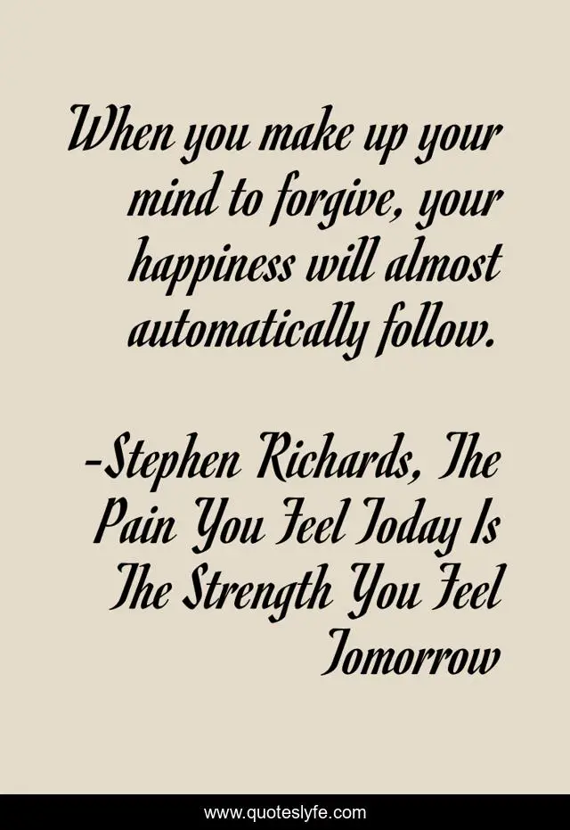 This page presents the quote "When you make up your mind to forgive, your happiness will almost automatically follow.". Author of this quote is Stephen Richards, The Pain You Feel Today Is The Strength You Feel Tomorrow. This quote is about empowering, confidence, moving-on-and-letting-go, healing-the-past, motivational, forgive, stephen-richards-author, stephen-richards, suffering,.