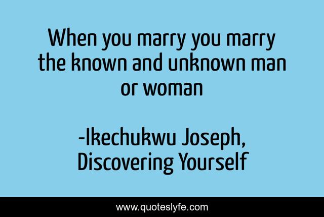 This page presents the quote "When you marry you marry the known and unknown man or woman". Author of this quote is Ikechukwu Joseph, Discovering Yourself. This quote is about self-discovery, christian-life, helping-others,.