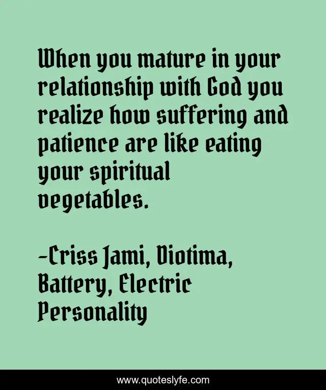 This page presents the quote "When you mature in your relationship with God you realize how suffering and patience are like eating your spiritual vegetables.". Author of this quote is Criss Jami, Diotima, Battery, Electric Personality. This quote is about spiritual, eating, apologetics, god, vegetables, character, maturity, suffering, unpleasant,.