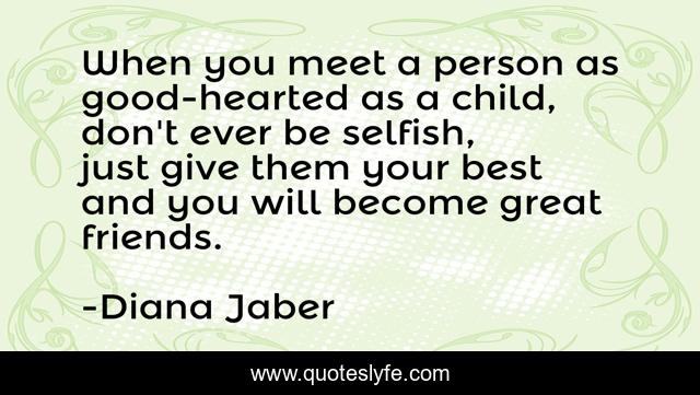 This page presents the quote "When you meet a person as good-hearted as a child, don't ever be selfish, just give them your best and you will become great friends.". Author of this quote is Diana Jaber. This quote is about life, honesty, friends, selflessness, truth, friendship,.