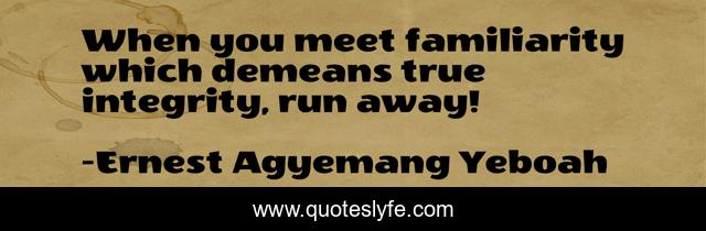 This page presents the quote "When you meet familiarity which demeans true integrity, run away!". Author of this quote is Ernest Agyemang Yeboah. This quote is about dignity, familiarity, humor, integrity, wisdom,.