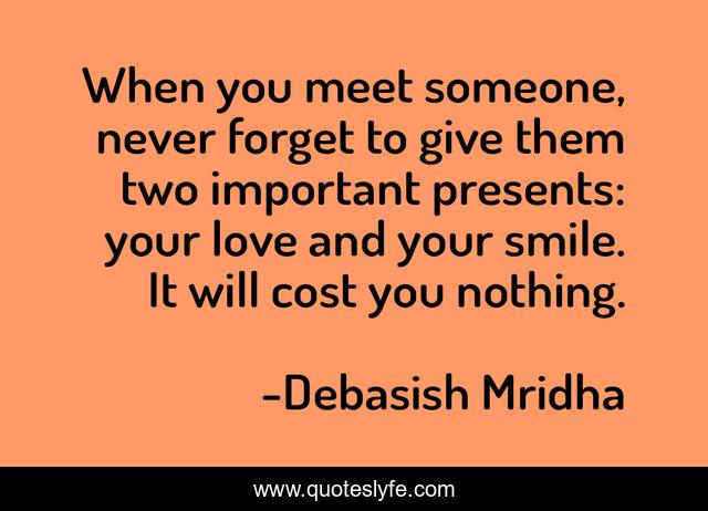 This page presents the quote "When you meet someone, never forget to give them two important presents: your love and your smile. It will cost you nothing.". Author of this quote is Debasish Mridha. This quote is about power-of-a-smile, life-wisdom, philosophy, debasish-mridha, debasish-mridha-m-d, quotes, give-a-smile, inspirational, enthusiasm,.