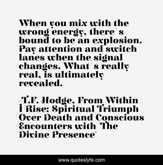 This page presents the quote "When you mix with the wrong energy, there's bound to be an explosion. Pay attention and switch lanes when the signal changes. What's really real, is ultimately revealed.". Author of this quote is T.F. Hodge, From Within I Rise: Spiritual Triumph Over Death and Conscious Encounters with "The Divine Presence". This quote is about real, evolve, life, combustion, explosion, power, conscious, revelation, energy,.