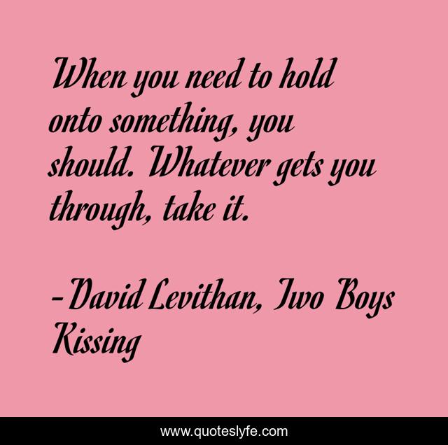 This page presents the quote "When you need to hold onto something, you should. Whatever gets you through, take it.". Author of this quote is David Levithan, Two Boys Kissing. This quote is about living, life, never-give-up, inspirational, enthusiasm,.