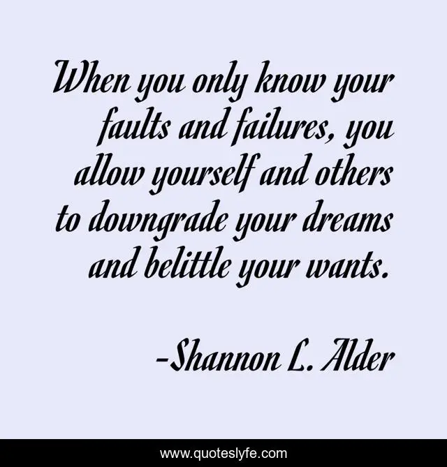 This page presents the quote "When you only know your faults and failures, you allow yourself and others to downgrade your dreams and belittle your wants.". Author of this quote is Shannon L. Alder. This quote is about confidence, knowing-your-value, finding-confidence, guilty, self-worth, minimizing-your-wants, faults, minimizing-your-needs, relationship-101,.