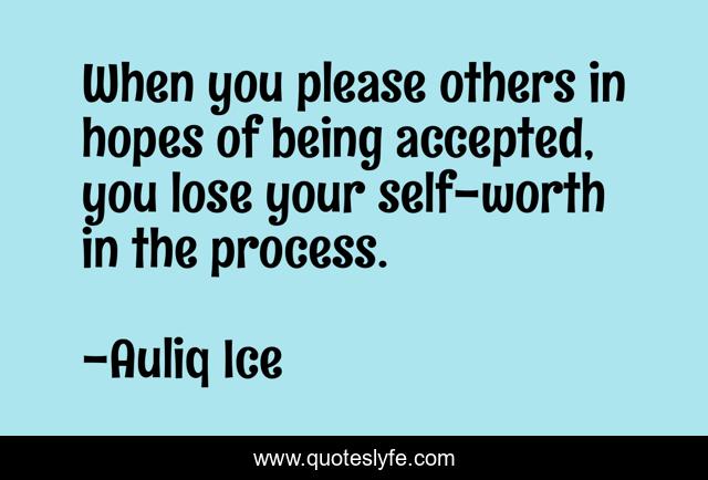 This page presents the quote "When you please others in hopes of being accepted, you lose your self-worth in the process.". Author of this quote is Auliq Ice. This quote is about self-love, acceptance, influence, worth, options, self-esteem,.