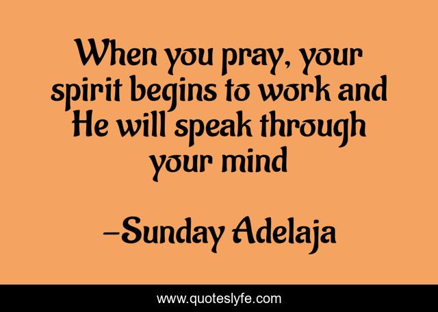 This page presents the quote "When you pray, your spirit begins to work and He will speak through your mind". Author of this quote is Sunday Adelaja. This quote is about life, goal, pray, work, mind, fulfillment, purpose, spirit, speak,.