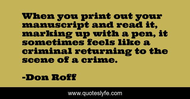 This page presents the quote "When you print out your manuscript and read it, marking up with a pen, it sometimes feels like a criminal returning to the scene of a crime.". Author of this quote is Don Roff. This quote is about print, revising, crime, manuscript, revision,.