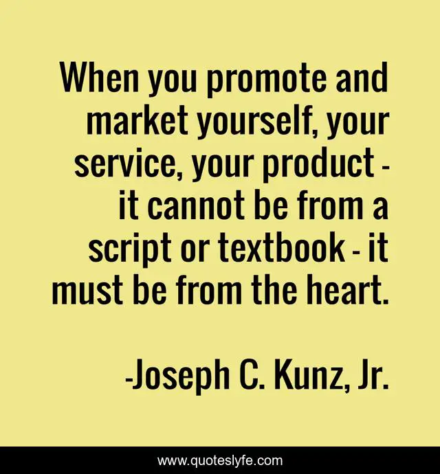 This page presents the quote "When you promote and market yourself, your service, your product - it cannot be from a script or textbook - it must be from the heart.". Author of this quote is Joseph C. Kunz, Jr.. This quote is about promotions, marketing, business, success,.