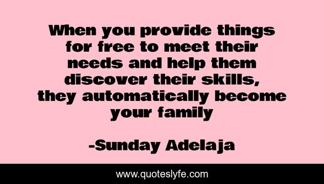 This page presents the quote "When you provide things for free to meet their needs and help them discover their skills, they automatically become your family". Author of this quote is Sunday Adelaja. This quote is about ministration, life, blessing, finance, meeting-needs, ministry, money, work, job,.