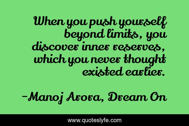 This page presents the quote "When you push yourself beyond limits, you discover inner reserves, which you never thought existed earlier.". Author of this quote is Manoj Arora, Dream On. This quote is about pushing-yourself, limits, pushing-the-limits, discover, reserves, limit, push-yourself-harder, inner-strength,.