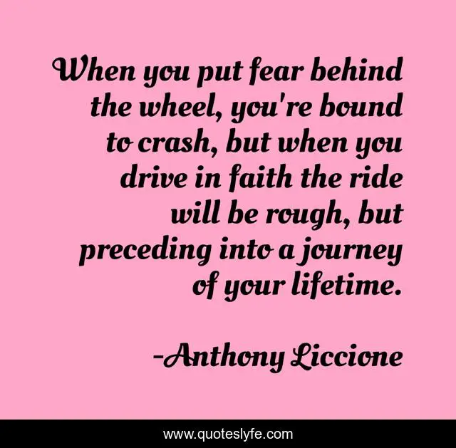 This page presents the quote "When you put fear behind the wheel, you're bound to crash, but when you drive in faith the ride will be rough, but preceding into a journey of your lifetime.". Author of this quote is Anthony Liccione. This quote is about faith, crash, drive, journey, lifetime, fear,.