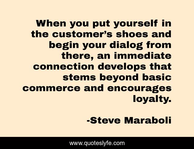 This page presents the quote "When you put yourself in the customer’s shoes and begin your dialog from there, an immediate connection develops that stems beyond basic commerce and encourages loyalty.". Author of this quote is Steve Maraboli. This quote is about customer, commerce, business, loyalty, service,.