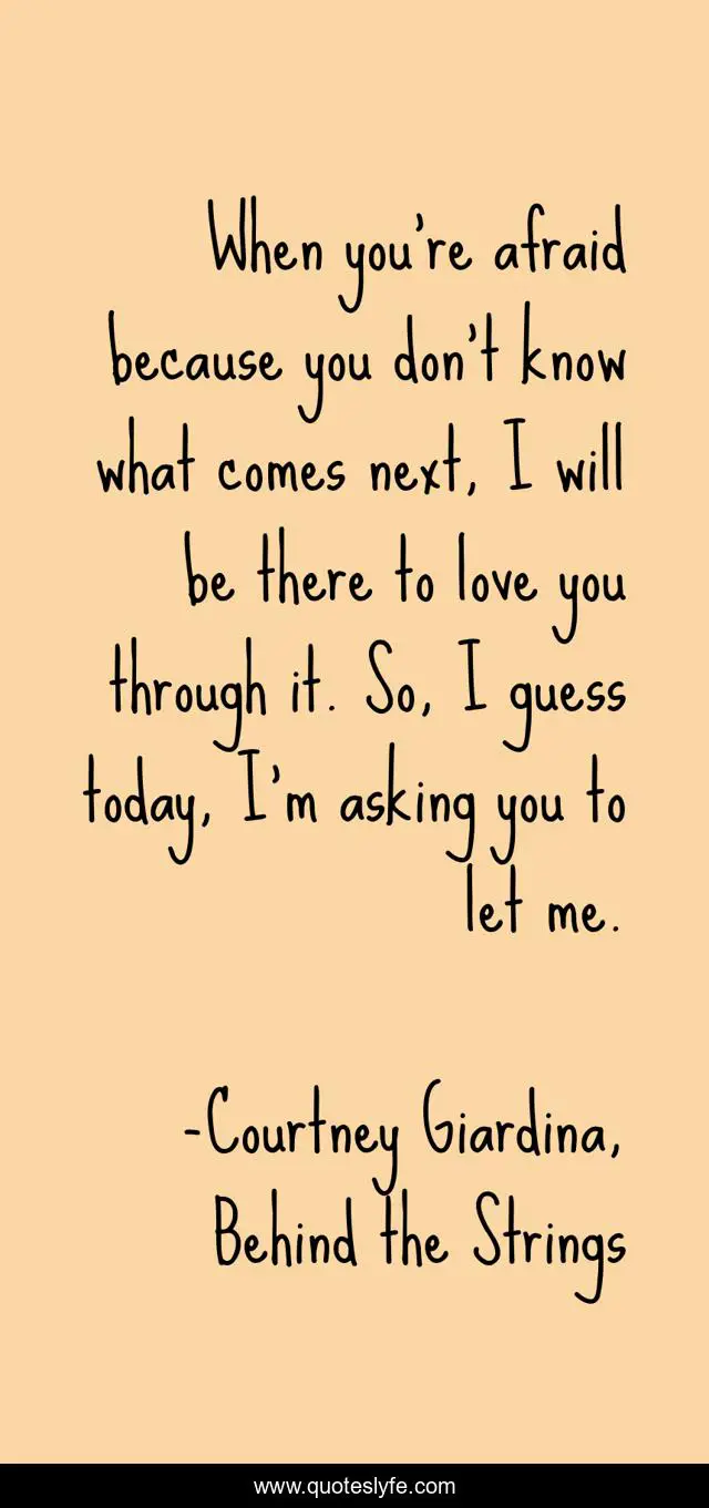 This page presents the quote "When you're afraid because you don't know what comes next, I will be there to love you through it. So, I guess today, I'm asking you to let me.". Author of this quote is Courtney Giardina, Behind the Strings. This quote is about drama, romance, lovers, love-and-sayings, love-story,.