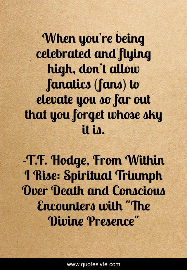 This page presents the quote "When you’re being celebrated and flying high, don’t allow fanatics (fans) to elevate you so far out that you forget whose sky it is.". Author of this quote is T.F. Hodge, From Within I Rise: Spiritual Triumph Over Death and Conscious Encounters with "The Divine Presence". .