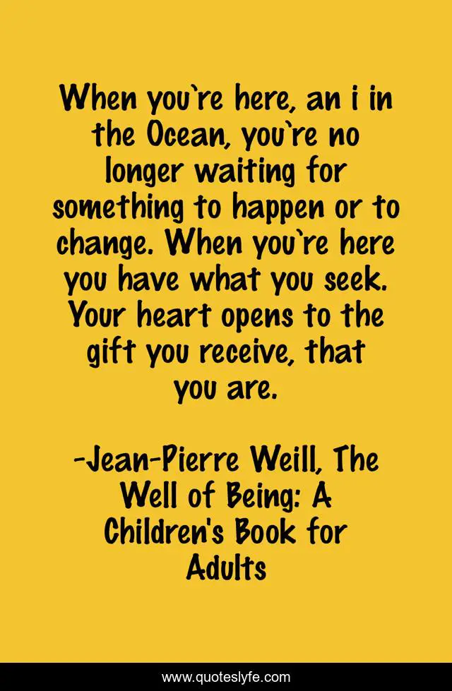This page presents the quote "When you’re here, an i in the Ocean, you’re no longer waiting for something to happen or to change. When you’re here you have what you seek. Your heart opens to the gift you receive, that you are.". Author of this quote is Jean-Pierre Weill, The Well of Being: A Children's Book for Adults. This quote is about selfhood, health, stories, perspective, well-being,.