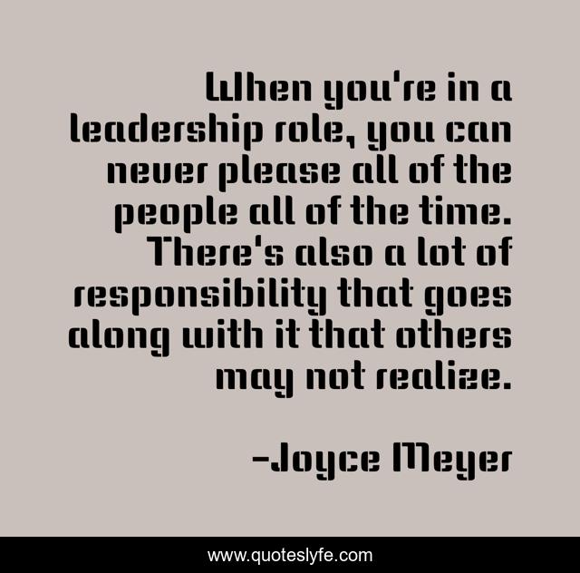 This page presents the quote "When you're in a leadership role, you can never please all of the people all of the time. There's also a lot of responsibility that goes along with it that others may not realize.". Author of this quote is Joyce Meyer. This quote is about time, responsibility, people,.