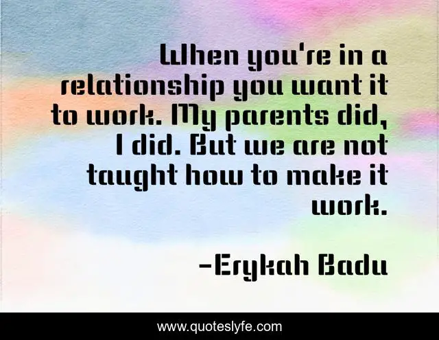 This page presents the quote "When you're in a relationship you want it to work. My parents did, I did. But we are not taught how to make it work.". Author of this quote is Erykah Badu. This quote is about work, parents,.
