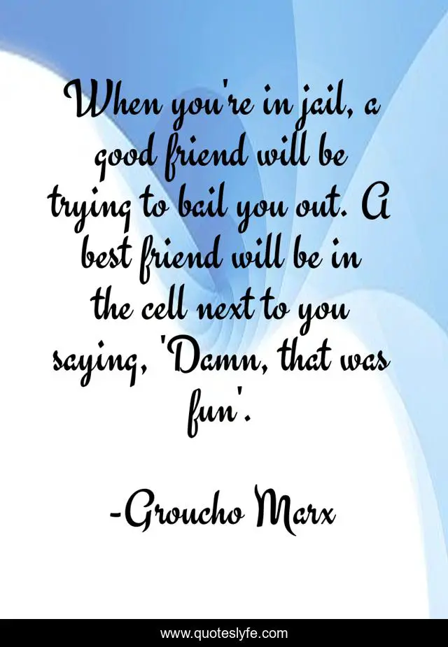 This page presents the quote "When you're in jail, a good friend will be trying to bail you out. A best friend will be in the cell next to you saying, 'Damn, that was fun'.". Author of this quote is Groucho Marx. This quote is about friends, humor, jail,.