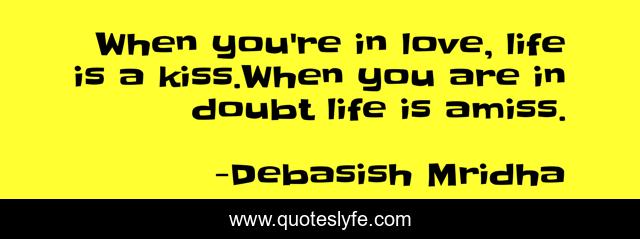 This page presents the quote "When you're in love, life is a kiss.When you are in doubt life is amiss.". Author of this quote is Debasish Mridha. This quote is about life, love, knowledge, inspirational, intelligence, philosophy, wisdom, quotes, affection,.