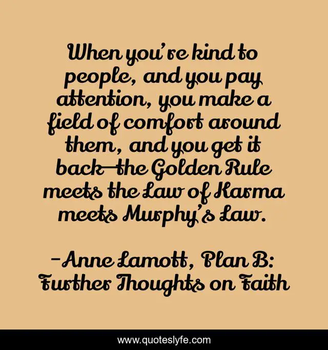 This page presents the quote "When you’re kind to people, and you pay attention, you make a field of comfort around them, and you get it back—the Golden Rule meets the Law of Karma meets Murphy’s Law.". Author of this quote is Anne Lamott, Plan B: Further Thoughts on Faith. This quote is about attention, people, comfort, golden-rule, law-of-karma, murphy-s-law,.