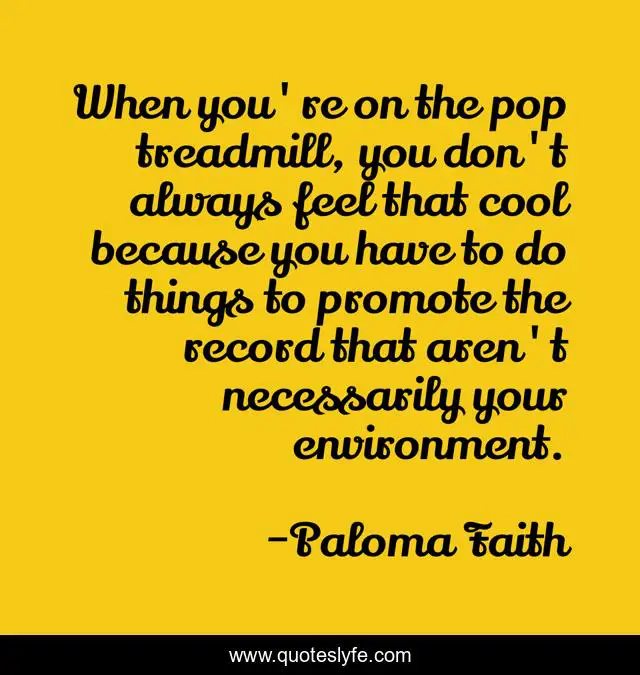 This page presents the quote "When you're on the pop treadmill, you don't always feel that cool because you have to do things to promote the record that aren't necessarily your environment.". Author of this quote is Paloma Faith. This quote is about environment, feel,.