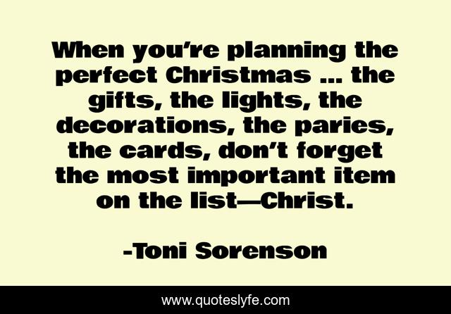 This page presents the quote "When you’re planning the perfect Christmas … the gifts, the lights, the decorations, the paries, the cards, don’t forget the most important item on the list—Christ.". Author of this quote is Toni Sorenson. This quote is about christ, christmas-romance, holidays,.
