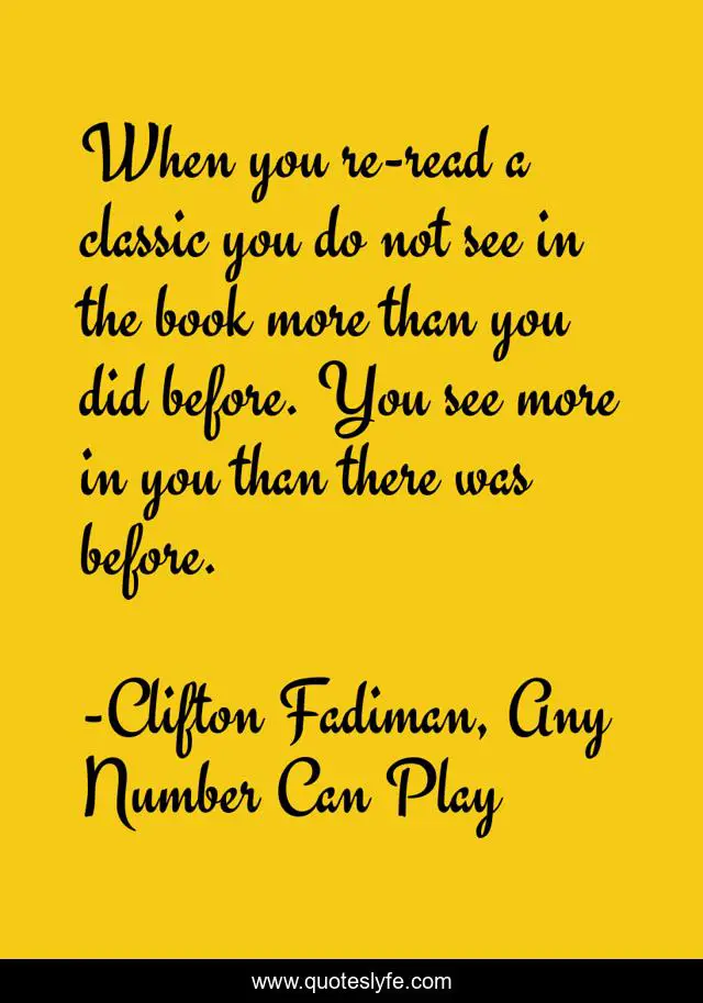 "Clifton Fadiman, Any Number Can Play Quotes." Quoteslyfe.com, 2025. Fri. 05 Dec. 2025. <https://www.quoteslyfe.com/quote/When-you-re-read-a-classic-you-42903>.