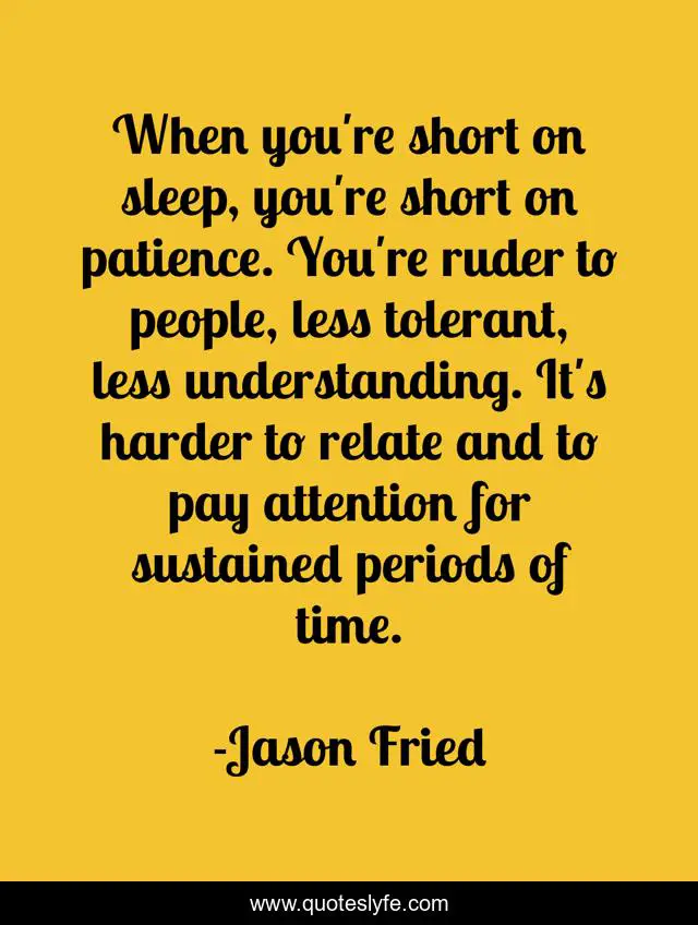 This page presents the quote "When you're short on sleep, you're short on patience. You're ruder to people, less tolerant, less understanding. It's harder to relate and to pay attention for sustained periods of time.". Author of this quote is Jason Fried. This quote is about short, sleep, time,.