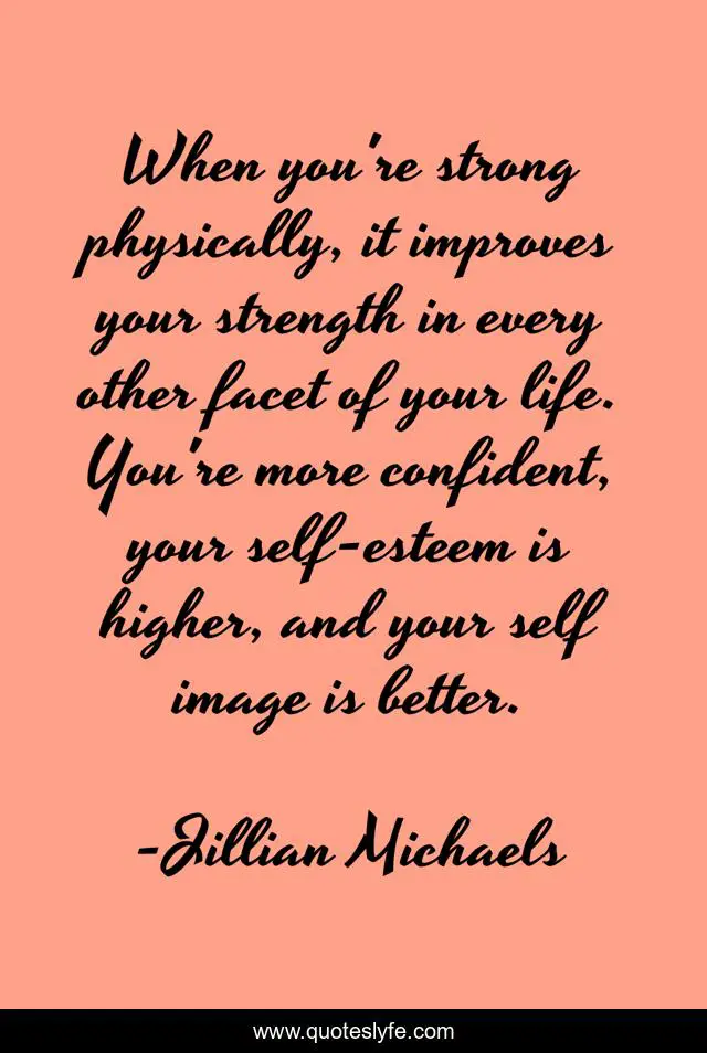 This page presents the quote "When you're strong physically, it improves your strength in every other facet of your life. You're more confident, your self-esteem is higher, and your self image is better.". Author of this quote is Jillian Michaels. This quote is about life, strong, self,.