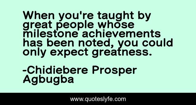 This page presents the quote "When you're taught by great people whose milestone achievements has been noted, you could only expect greatness.". Author of this quote is Chidiebere Prosper Agbugba. This quote is about teaching, greatness, inspirational, enthusiasm,.