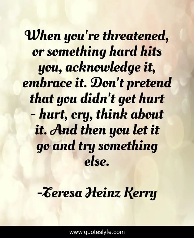 This page presents the quote "When you're threatened, or something hard hits you, acknowledge it, embrace it. Don't pretend that you didn't get hurt - hurt, cry, think about it. And then you let it go and try something else.". Author of this quote is Teresa Heinz Kerry. This quote is about pretend, cry, hurt,.
