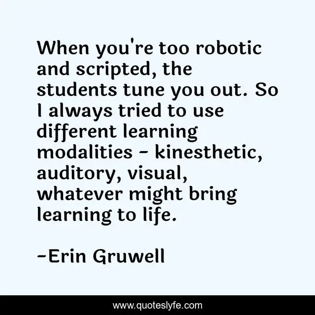 This page presents the quote "When you're too robotic and scripted, the students tune you out. So I always tried to use different learning modalities - kinesthetic, auditory, visual, whatever might bring learning to life.". Author of this quote is Erin Gruwell. This quote is about students, life,.