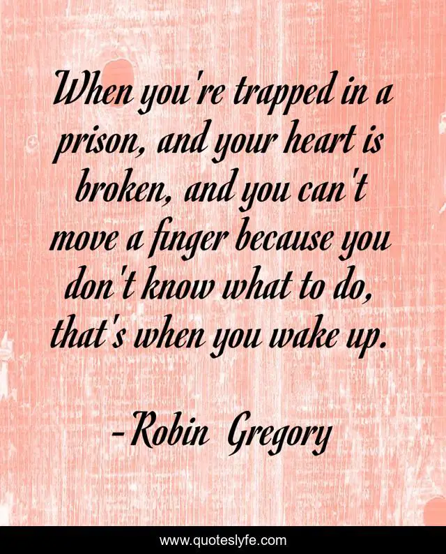 This page presents the quote "When you're trapped in a prison, and your heart is broken, and you can't move a finger because you don't know what to do, that's when you wake up.". Author of this quote is Robin Gregory. .