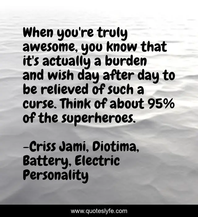 This page presents the quote "When you're truly awesome, you know that it's actually a burden and wish day after day to be relieved of such a curse. Think of about 95% of the superheroes.". Author of this quote is Criss Jami, Diotima, Battery, Electric Personality. This quote is about curse, superhero, wish, awesome, burden, heroes,.