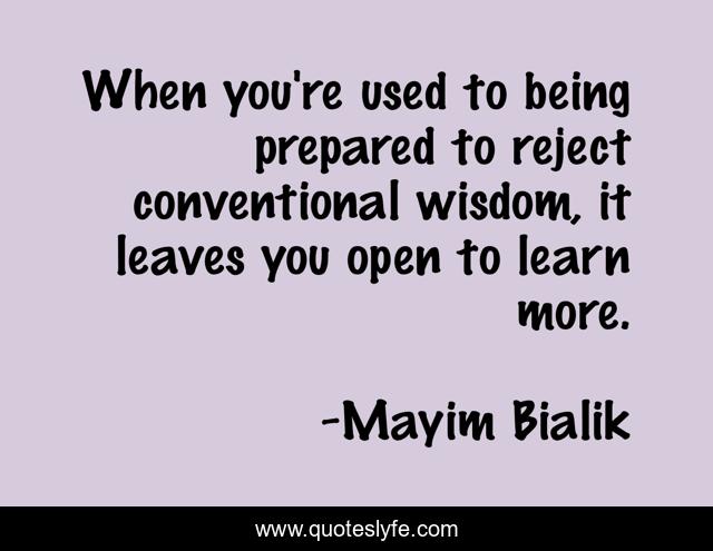 This page presents the quote "When you're used to being prepared to reject conventional wisdom, it leaves you open to learn more.". Author of this quote is Mayim Bialik. This quote is about learn, prepared,.