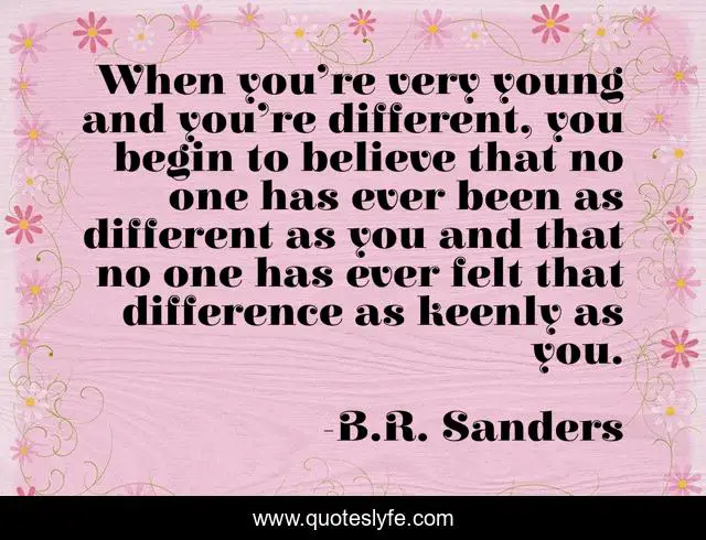 This page presents the quote "When you’re very young and you’re different, you begin to believe that no one has ever been as different as you and that no one has ever felt that difference as keenly as you.". Author of this quote is B.R. Sanders. This quote is about society, life, perception, concept-of-self,.