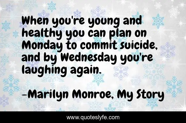 This page presents the quote "When you're young and healthy you can plan on Monday to commit suicide, and by Wednesday you're laughing again.". Author of this quote is Marilyn Monroe, My Story. This quote is about suicide, marilyn-monroe, my-story,.