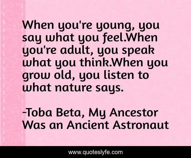 This page presents the quote "When you're young, you say what you feel.When you're adult, you speak what you think.When you grow old, you listen to what nature says.". Author of this quote is Toba Beta, My Ancestor Was an Ancient Astronaut. This quote is about old, feel, young, adult, think, listen,.