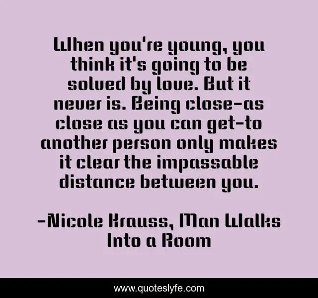 This page presents the quote "When you're young, you think it's going to be solved by love. But it never is. Being close-as close as you can get-to another person only makes it clear the impassable distance between you.". Author of this quote is Nicole Krauss, Man Walks Into a Room. This quote is about youth, loneliness, love, affection,.