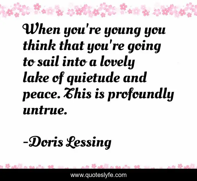 This page presents the quote "When you're young you think that you're going to sail into a lovely lake of quietude and peace. This is profoundly untrue.". Author of this quote is Doris Lessing. This quote is about think, lake,.