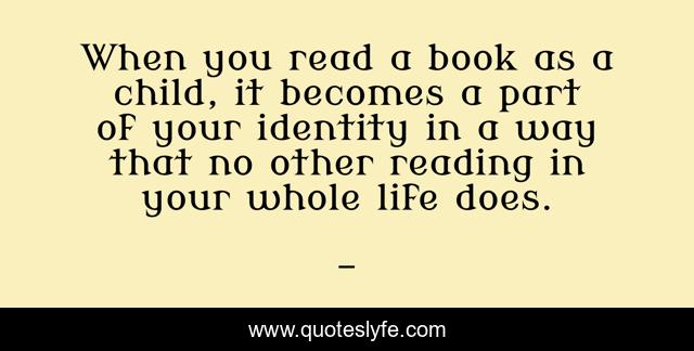 This page presents the quote "When you read a book as a child, it becomes a part of your identity in a way that no other reading in your whole life does.". Author of this quote is . This quote is about books, reading, child,.