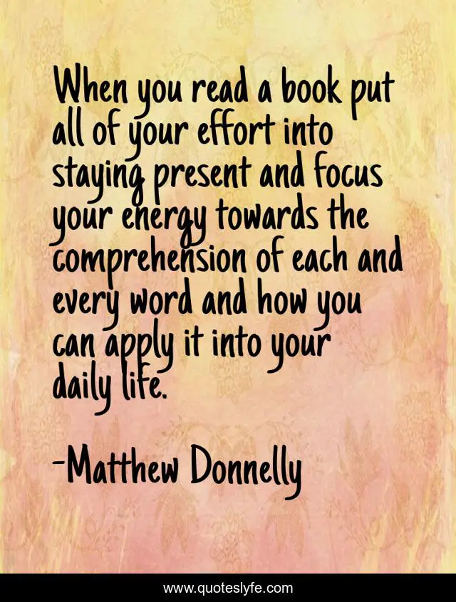 This page presents the quote "When you read a book put all of your effort into staying present and focus your energy towards the comprehension of each and every word and how you can apply it into your daily life.". Author of this quote is Matthew Donnelly. This quote is about action, books, present-moment, comprehension,.