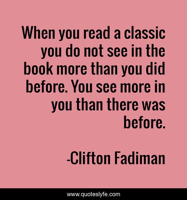 This page presents the quote "When you read a classic you do not see in the book more than you did before. You see more in you than there was before.". Author of this quote is Clifton Fadiman. This quote is about books, reading,.