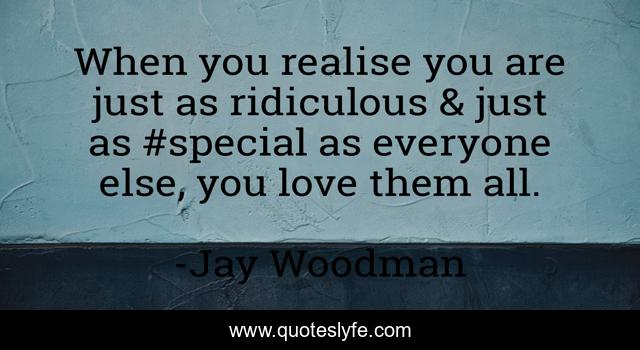 This page presents the quote "When you realise you are just as ridiculous & just as #special as everyone else, you love them all.". Author of this quote is Jay Woodman. This quote is about self, ridiculous, love, special, affection,.