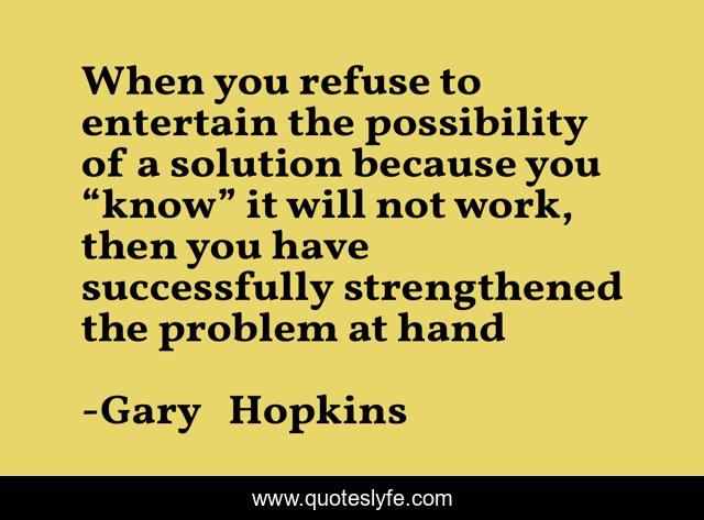 This page presents the quote "When you refuse to entertain the possibility of a solution because you “know” it will not work, then you have successfully strengthened the problem at hand". Author of this quote is Gary Hopkins. This quote is about spiritual-growth, god, spirituality, oneness, energy-healing, inspirational, higher-self, enthusiasm, enlightenment,.