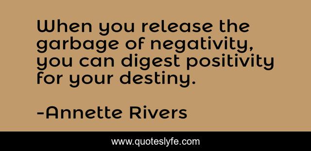 This page presents the quote "When you release the garbage of negativity, you can digest positivity for your destiny.". Author of this quote is Annette Rivers. This quote is about tx, ny, annetterivers, entreprenuer, lifecoach, destinydriven, leader, mbs,.